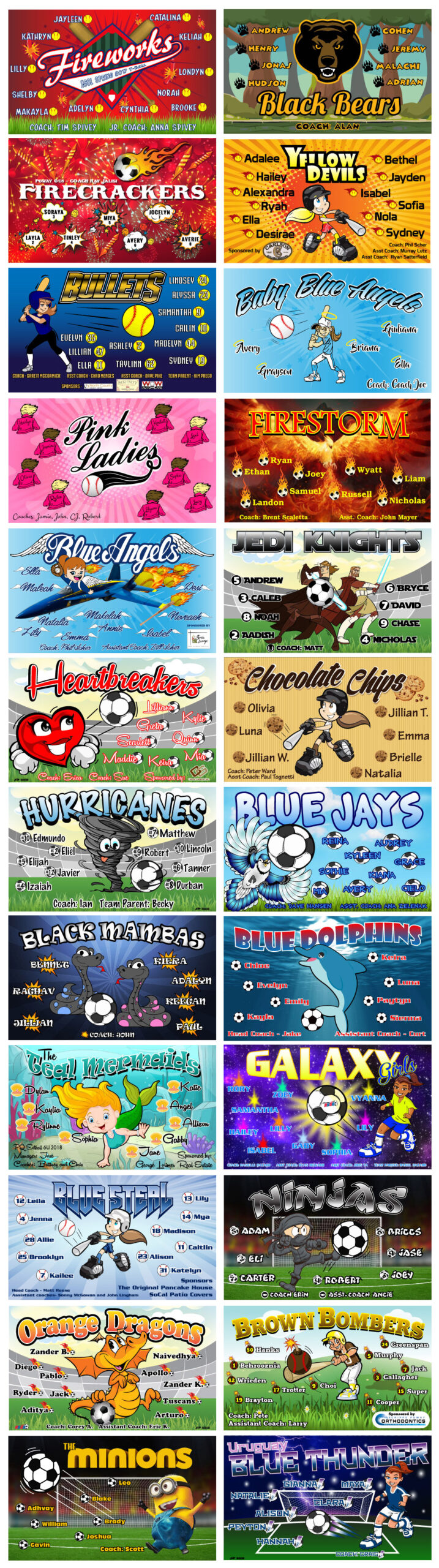 Your custom designed team banner will be $119.00 plus tax. Banner size is 5 x 3 feet. You can also get mini team banners for all players that measure 12 x 8 inches for $8.00 each. Package deal is $159 for both. I also offer banner stands for an additional $65. Free graphic design will begin after your order has been submitted here. We will send you a digital proof for your review via email or text. Before you approve design and manufacturing of your banner PLEASE make sure ALL players are on the banner… Many times a new player will be added by coaching staff right after the customer approves the design and we have already printed banners…So please check with coaching staff BEFORE final approval. Graphic design and printing takes about 2-3 days.